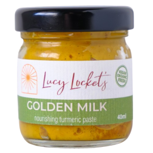 Lucy Locket’s Golden Milk concentrate – a beautiful fragrant nutritious paste made of fresh organic living ingredients – turmeric root, ginger root, real vanilla bean, hand milled black pepper, honey and extra virgin coconut oil. Incredibly healthy and vegetarian.